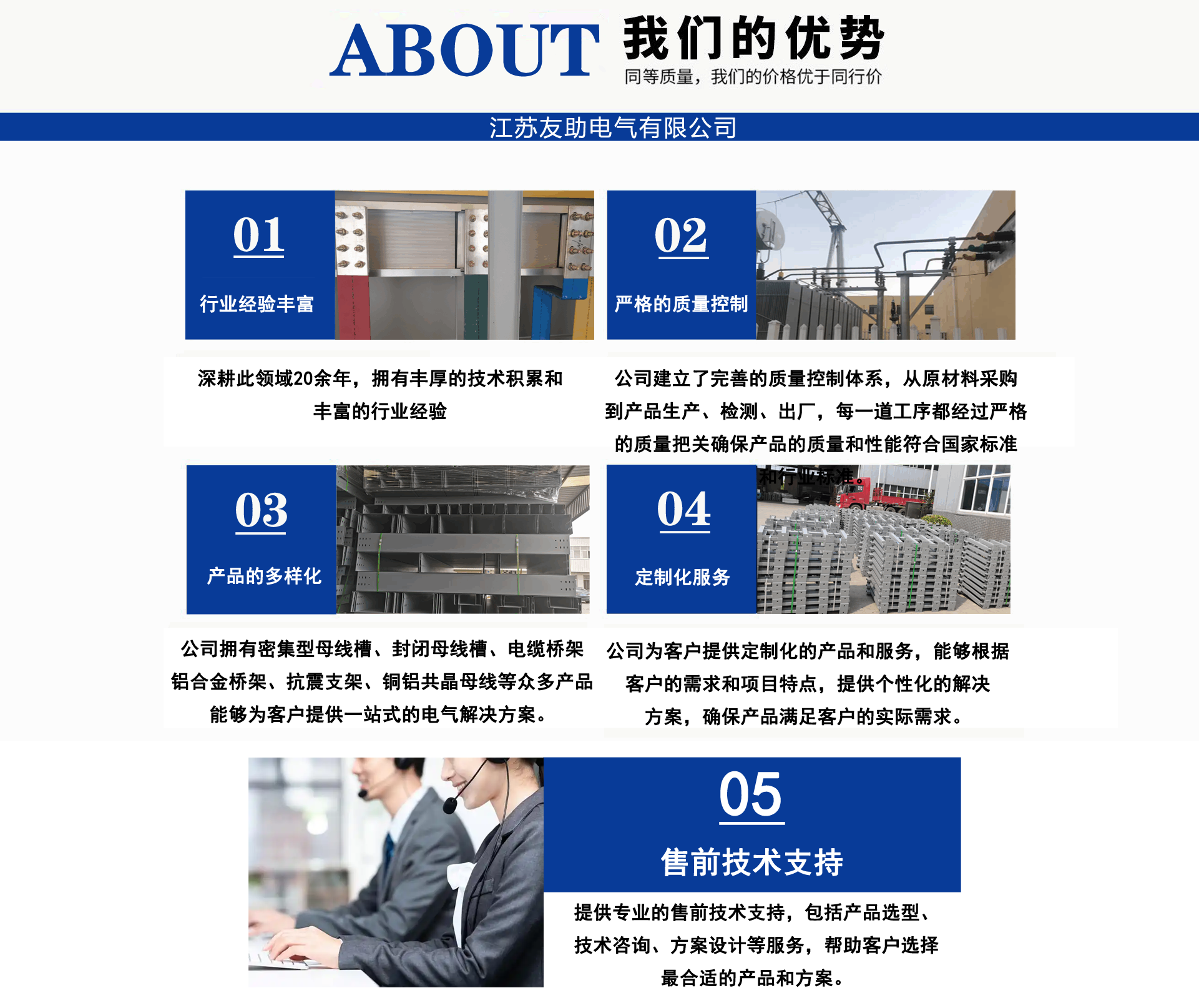 江蘇友助電氣有限公司地處中國工程電氣生產(chǎn)基地-一江蘇省揚中市。經(jīng)營范圍:電纜橋架,母線槽(橋),管型母線,銅軟連接(伸縮節(jié)),高低壓開關(guān)柜,配電箱,抗震支架產(chǎn)品系列。 公司宗旨:客戶至上。已成功為江蘇二十屆省運會會場-泰州體育館,南京寶龍商業(yè)綜合體,張家口百兆瓦風(fēng)電場,濟源市婦幼醫(yī)院,威海市未來科技園,湖北皇恩燁新材料科技有限公司,南京中央路小學(xué),南通中天大酒店,新疆新安特鋼有限公司,河北省送變電有限公司,南京南微醫(yī)學(xué)研發(fā)基地等多項工程配套服務(wù),我們愿與您精誠合作,互利共贏!公司技術(shù)人員深耕橋架,母線領(lǐng)域30年,為您提供橋架,母線槽疑難問題解決方案。母線槽不論每相是單排,雙排,三根排重疊,不管有多少個水平彎、垂直彎,轉(zhuǎn)接排在發(fā)貨前預(yù)裝一遍,確保尺寸無誤。到現(xiàn)場直接擰螺絲,效率高,橫平豎直,規(guī)規(guī)矩矩,符合標(biāo)準(zhǔn),供電局,業(yè)主,監(jiān)理,驗收易通過。供貨周期3-7天。為了讓尊貴客戶您,設(shè)備安全通電,高枕無憂。我們提供如下售前售中售后服務(wù): 售前:免費技術(shù)支持,咨詢。 售中:免費現(xiàn)場精確測繪、設(shè)計。 售后:安裝服務(wù),免費指導(dǎo)。 質(zhì)量是生命,客戶是源泉。承諾客戶的,一定全力做到。讓我們一起進(jìn)步!...
